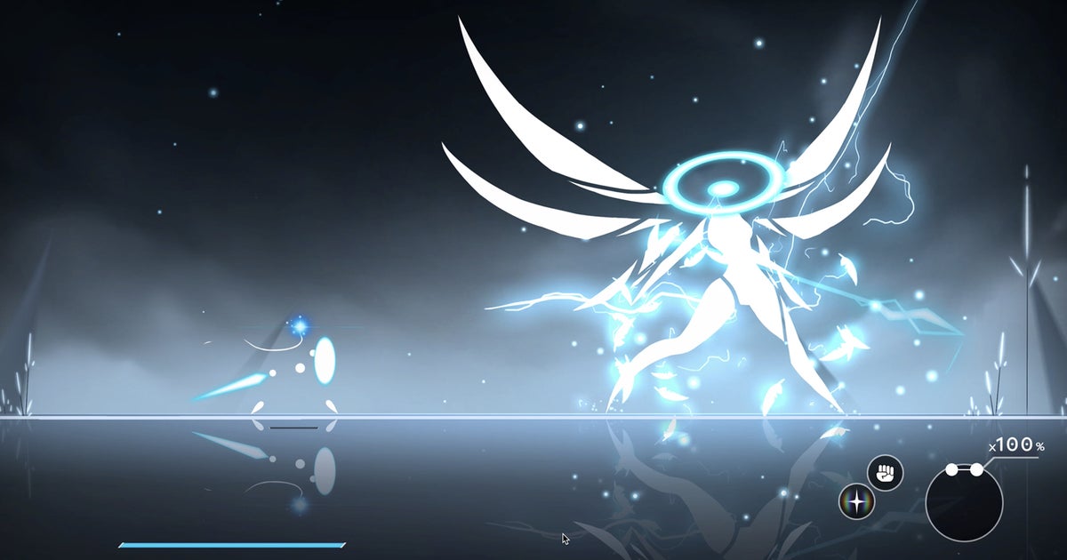 OK, so there's plenty in Worldless that won't remind you of Silksong or its predecessor, Hollow Knight. Rather than a medieval bug exploring a labyrinth of bioluminescent rot and lore, you're a vaguely humanoid cloud of shards and points, roaming an abstract landscape of soft curves and shafts of light. You're Rayman but fancy, basically, and the world is no world but an uncreated expanse of elemental forces, though you'll find you can run and jump on it much as you can the ledges of Hallownest. The combat is a different beast, too. Rather than Souls-inflected 2D hack-and-slash, it's turn-based battling with a twist - each turn gives you a countdown in which to perform real-time combos, mixing melee and magical attacks.